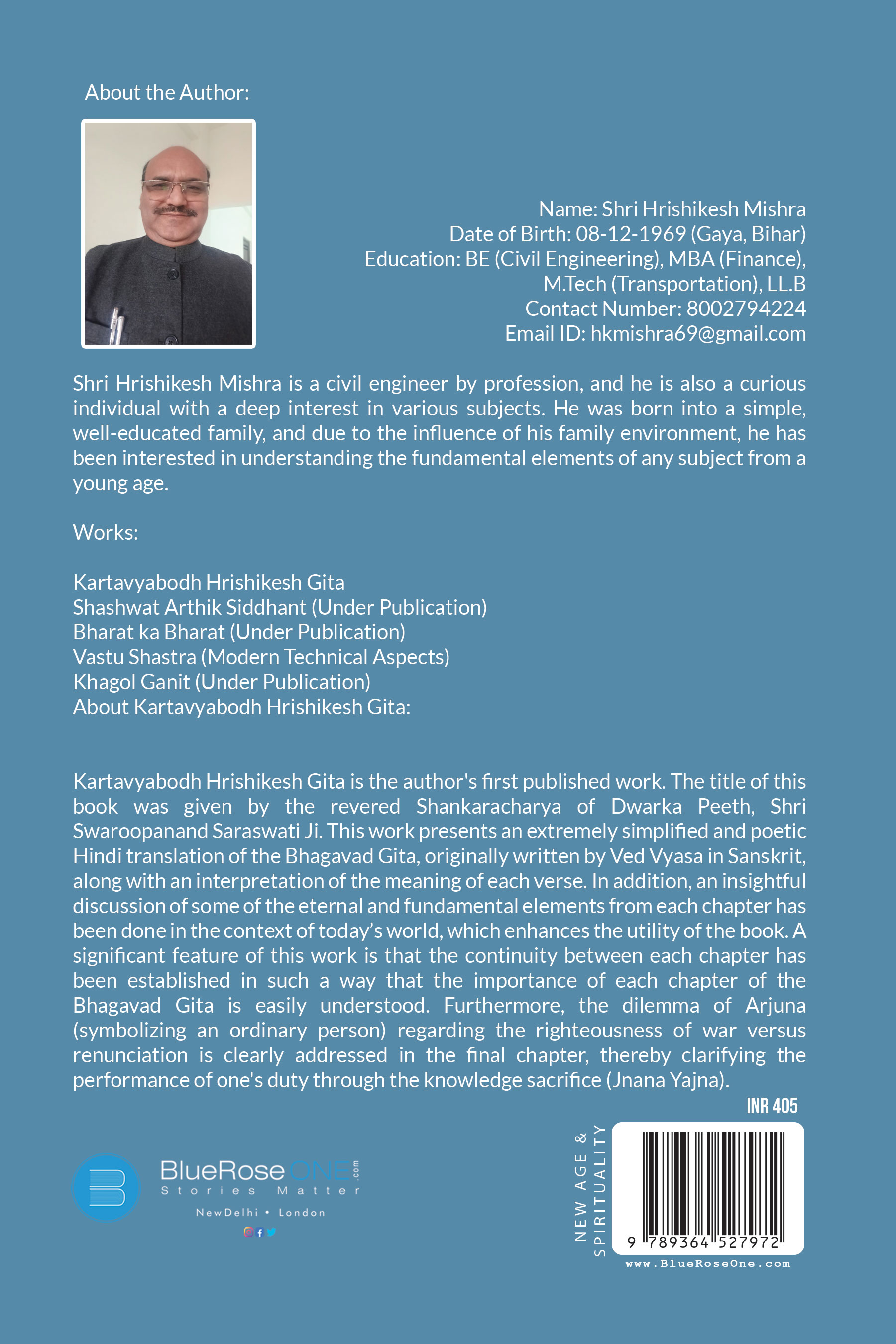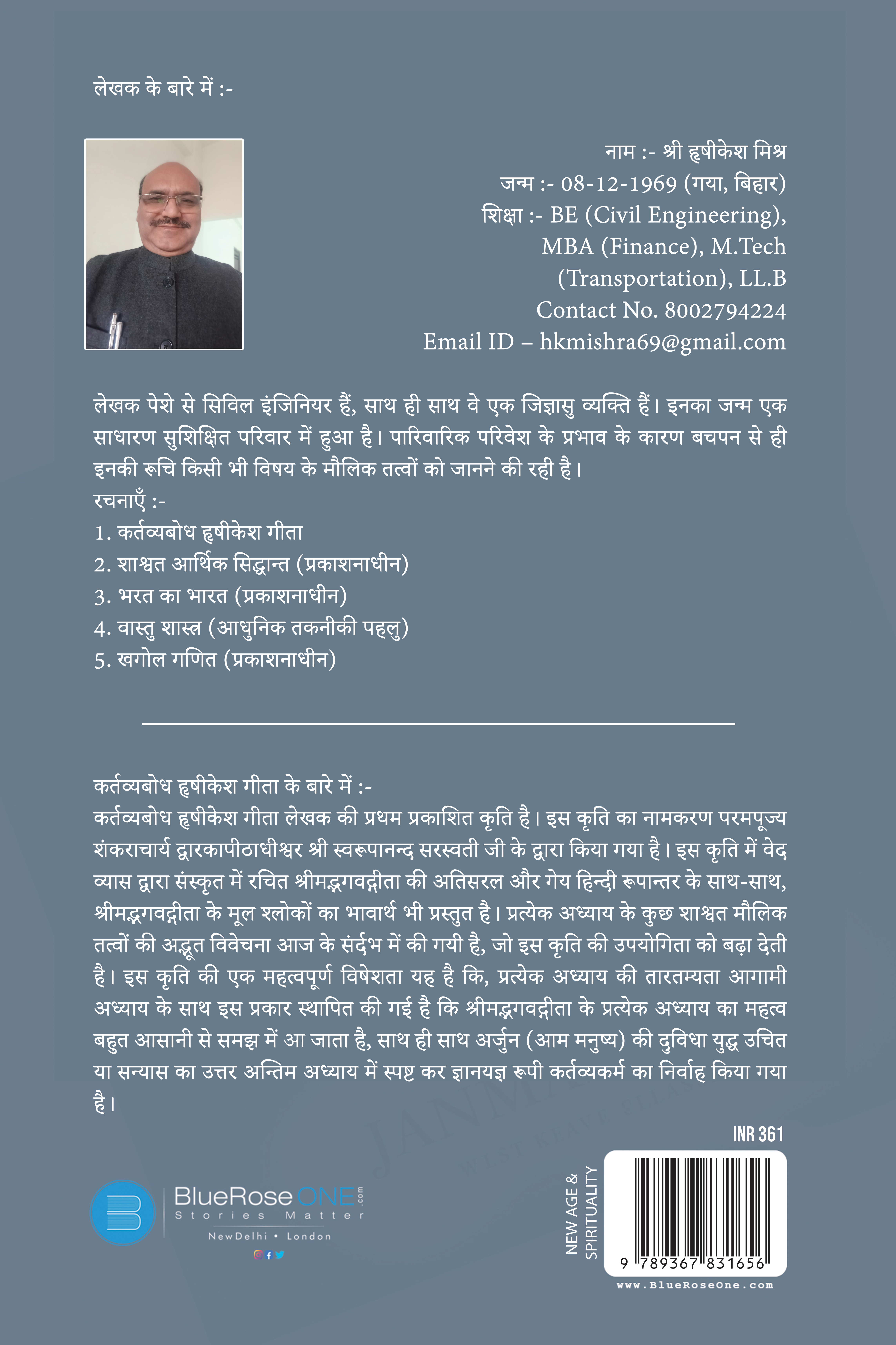Hrishikesh Mishra, born on 8th December 1969 in Gaya, Bihar, is a civil engineer with a diverse academic background. He holds a BE in Civil Engineering, an M-Tech in Transportation Engineering, an MBA in Finance, and a degree in Law (LLB). With a deep-seated passion for knowledge, Hrishikesh has always been a seeker of wisdom, combining traditional insights with modern understanding. Raised in a modest yet well-educated family, his intellectual curiosity has led him to explore a variety of subjects. His work reflects this blend of ancient wisdom and contemporary thought. Hrishikesh’s published book, *Kratvyabodh Hrishikesh Gita* (Hindi), showcases his unique perspective on life and its principles. He can be contacted at 8002794224 or via email at hkmishra69@gmail.com.