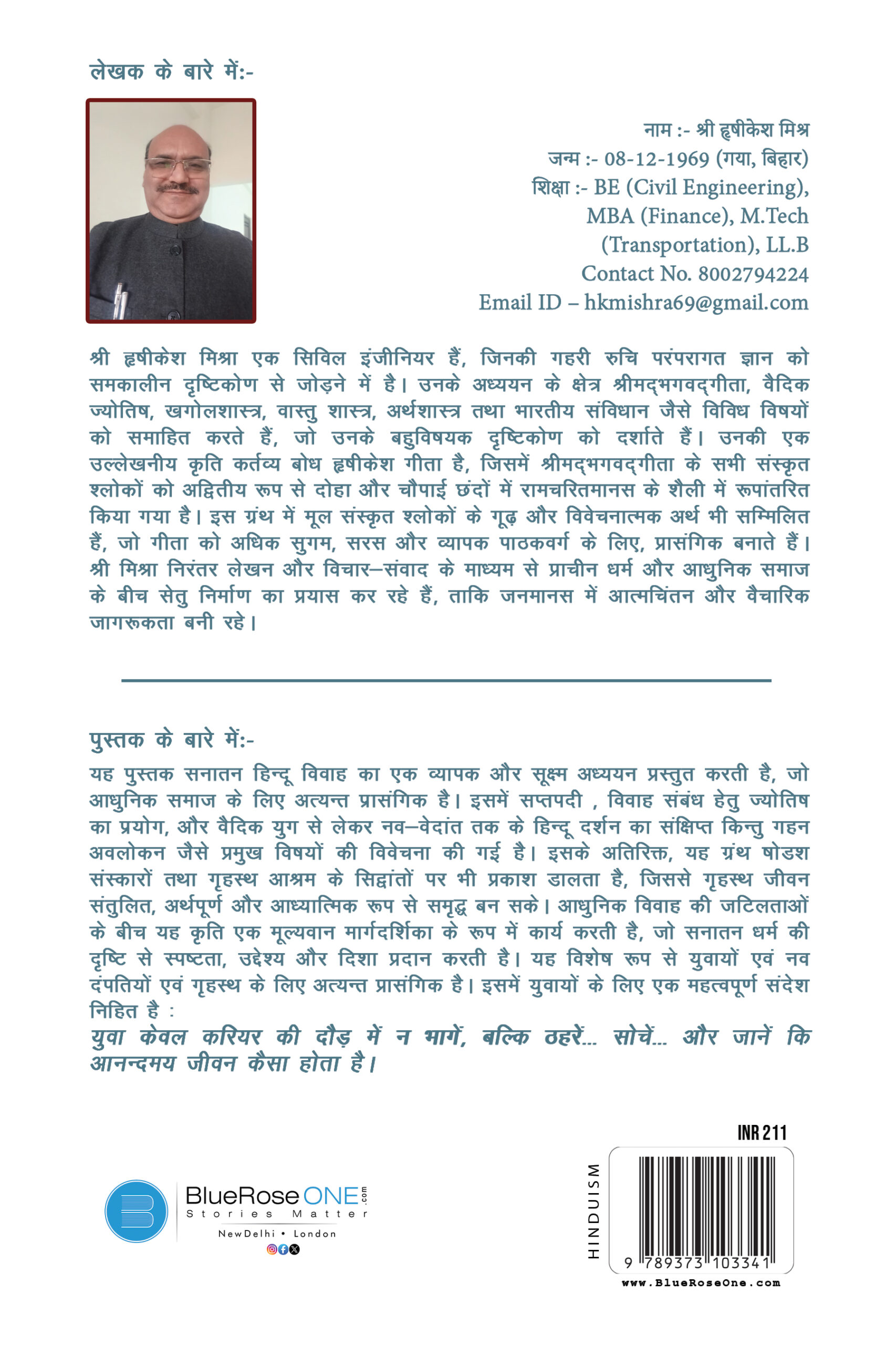 This book presents a comprehensive and insightful study of Sanatan Hindu marriage, emphasizing its enduring relevance in contemporary society. It explores key themes such as the Saptapadi (seven sacred steps of marriage), the influence of astrology in life and relationships, and offers a concise yet profound overview of Hindu philosophy from the Vedic period to Neo-Vedanta. Additionally, it delves into the Shodasha Samskaras (sixteen sacraments) and the principles of the Grihastha Ashram, outlining the responsibilities, values, and daily practices essential for a balanced and meaningful married life.